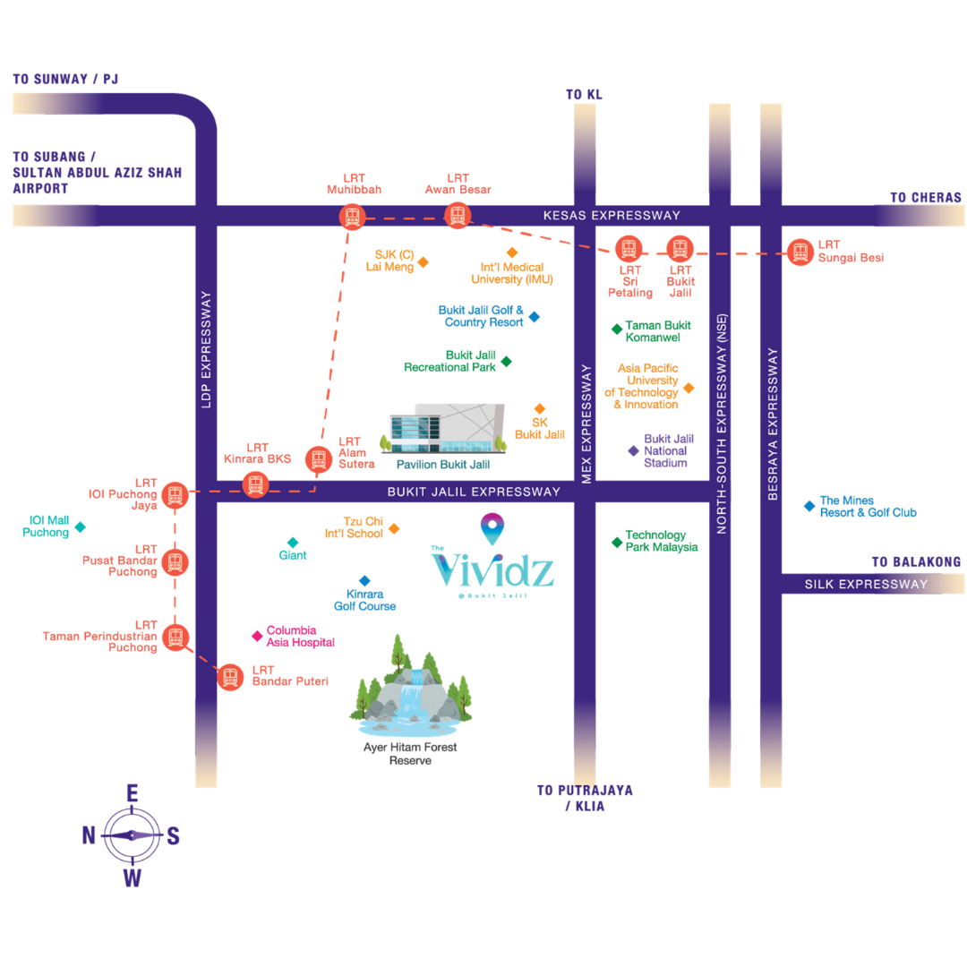 Vividz @ Bukit Jalil is located within a well-connected area of Bukit Jalil, with convenient access to major highways such as KESAS, the Bukit Jalil Highway, and the MEX Expressway. Just a short drive from Pavilion Bukit Jalil, residents can enjoy nearby retail outlets and landscaped green spaces — offering a balance of convenience and natural surroundings.